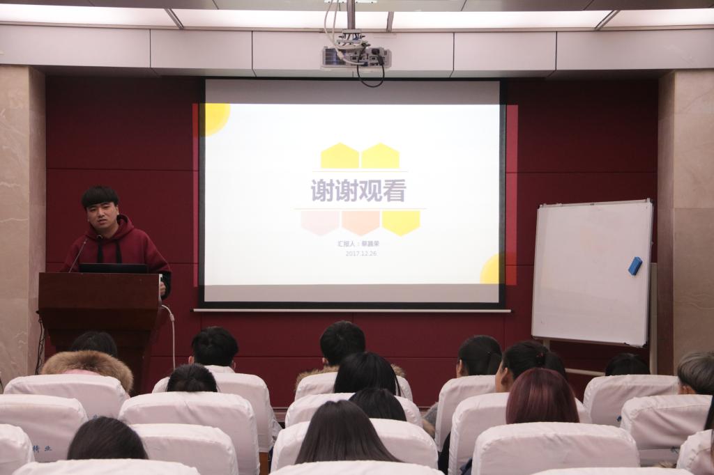 会议伊始,主持人亢鑫先就艺术团组成做了简单介绍。目前,艺术团共下设舞蹈团,清粼水韵合唱团,主持团三个分团。接下来,各分团团长就学期总结,面临的困境及未来展望等上台进行汇报。现担任清粼水韵合唱团团长的方彤竹率先发言,她从团建,17回首,18展望,日常管理四个方面展开,并谈及了自己担任团长以来的心路历程“很多人都是第一次加入合唱团,而我也是第一次当团长。大家都在一起不断探索,不断前行。我们因为兴趣选择走在一起,也希望因为兴趣能够坚持下去。”之后,舞蹈团团长曹明慧则从舞蹈团介绍,组成,活动及展望四个方面进行汇报,于2016年才成立的舞蹈团至今已为学院争得多项荣誉,在第一,二届舞蹈大赛中均取得了不俗的成绩,并积极参与院里的多次晚会及赛事,为学院的文艺事业做出了较大贡献。主持团团长蔡昌荣围绕主持团成立目的,学期回顾及未来展望三方面进行展示,并采取SWOT分析就主持团的优势,劣势,机会及威胁进行介绍,“目前,主持团的优势便是训练方式,可以针对个人进行碎片化时间的训练,对时间要求不是太高,而劣势则是自身素质,作为刚成立的分团,很多事情都处于慢慢摸索中,机制也不太成熟。机会便是院里的活动比较丰富,可以为主持团成员提供多次上场主持的机会,威胁则是资源分配方面稍显不足,今后应当跟进资源分配。”
